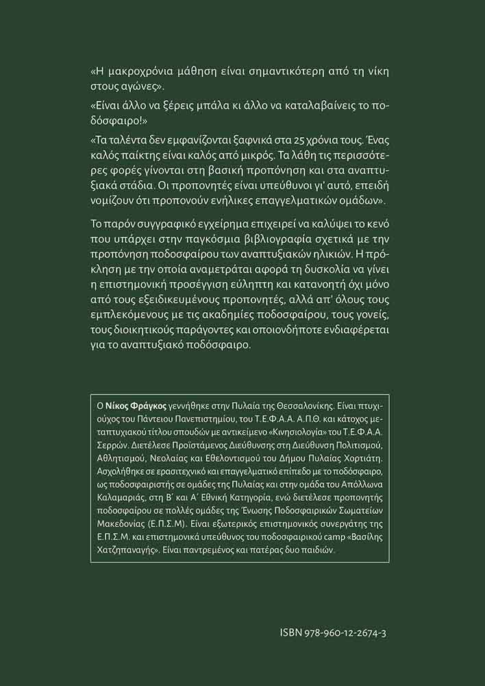 Η προσέγγιση της προπόνησης ποδοσφαίρου των αναπτυξιακών ηλικιών είναι εντελώς διαφορετική από εκείνη της προπόνησης των ενηλίκων σε παιδαγωγικό-κοινωνικό, τεχνικοτακτικό και ψυχοκοινωνικό επίπεδο. Προπονητές, παράγοντες του ποδοσφαίρου και γονείς οφείλουν να προσαρμόσουν τη στάση τους στις ανάγκες του κάθε ηλικιακού - αναπτυξιακού σταδίου και όχι να αντιμετωπίζουν τα παιδιά ως μικρούς ενήλικες. Το παραπάνω μείζονος σημασίας θέμα καταγράφεται στο παρόν πόνημα με συστηματικό-επιστημονικό τρόπο και στοχεύει στην άμβλυνση του κενού που υπάρχει στη σύγχρονη βιβλιογραφία. Ο συγγραφέας αξιοποιώντας την ποδοσφαιρική του πείρα, τη γνώση και τη συνεχή μελέτη της επιστήμης του αθλητισμού, προσφέρει μια πλήρη και αντικειμενική ανάλυση του προβλήματος που συναντάται κατά κόρον στις ελληνικές ακαδημίες ποδοσφαίρου και επιχειρεί να δώσει τις ενδεδειγμένες λύσεις. Γονείς, προπονητές, διοικητικοί παράγοντες, φίλαθλοι του παιδικού ποδοσφαίρου θα βρουν κυριολεκτικά απαντήσεις, καθώς όλα τα ζητήματα τίθενται με τη μορφή ερωτήσεων και απαντήσεων. Η φιλοσοφία που προτείνεται ανάγει το ποδόσφαιρο σε ένα συνδυαστικό παιχνίδι μυαλού και σωματικής κίνησης. Δίνει βαρύτητα στη μακροχρόνια προπονητική διαδικασία μάθησης, στο μυαλό, στην ψυχική ανθεκτικότητα του νεαρού ποδοσφαιριστή. Βασικός στόχος της θεωρίας αυτής, που ήδη εφαρμόζεται σε ακαδημίες προηγμένων ευρωπαϊκών ομάδων, είναι να δημιουργήσει ολοκληρωμένες προσωπικότητες που ακόμα και αν αποτύχουν να σταδιοδρομήσουν επαγγελματικά στο ποδόσφαιρο, θα έχουν μια επιτυχημένη καριέρα έξω από αυτό. ● Ο Νίκος Φράγκος είναι πτυχιούχος του Πάντειου Πανεπιστημίου, του Τ.Ε.Φ.Α.Α. Α.Π.Θ., κάτοχος μεταπτυχιακού τίτλου του Τ.Ε.Φ.Α.Α. Σερρών (Α.Π.Θ.) με αντικείμενο την κινησιολογία του αθλητή, εξωτερικός επιστημονικός συνεργάτης για τις αναπτυξιακές ηλικίες στην Ε.Π.Σ.Μ., επιστημονικός υπεύθυνος του camp «Βασίλης Χατζηπαναγής» και ασχολείται επαγγελματικά και ερασιτεχνικά με το ποδόσφαιρο στην πόλη της Θεσσαλονίκης.